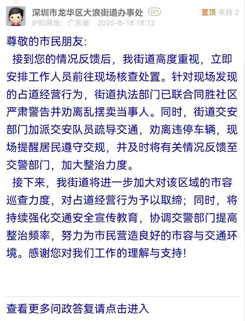 接下來,我街道將進(jìn)一步加大對(duì)該區(qū)域的市容巡查力度,對(duì)占道經(jīng)營行為予以取締;同時(shí),將持續(xù)強(qiáng)化交通安全宣傳教育,協(xié)調(diào)交警部門提高整治頻率,努力為市民營造良好的市容與交通環(huán)境。感謝您對(duì)我們工作的理解與支持!