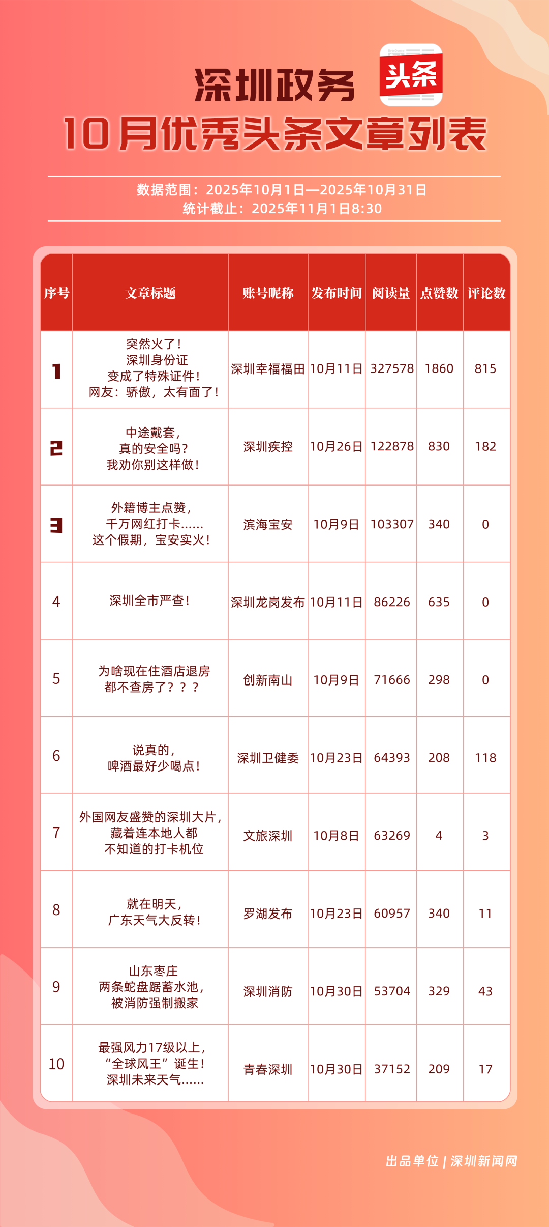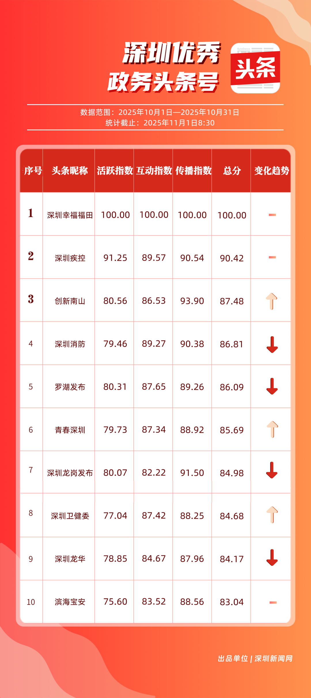 10月,“深圳幸福福田”“深圳疾控”“創(chuàng)新南山”“深圳消防”“羅湖發(fā)布”“青春深圳”“深圳龍崗發(fā)布”“深圳衛(wèi)健委”“深圳龍華”“濱海寶安”共10個政務(wù)頭條號入選“優(yōu)秀政務(wù)頭條號”榜單?!吧钲谛腋8L铩痹诨钴S、互動、傳播均收獲較好成果,蟬聯(lián)榜首;“深圳疾控”得分超90分,持續(xù)發(fā)布民生健康類內(nèi)容,為市民健康保駕護航;“創(chuàng)新南山”內(nèi)容創(chuàng)作緊扣民生與區(qū)域特色,位列榜單第三名?!吧钲谙馈薄傲_湖發(fā)布”等賬號也位列榜單前列,成為區(qū)域政務(wù)新媒體內(nèi)容創(chuàng)新、信息傳遞的標桿。