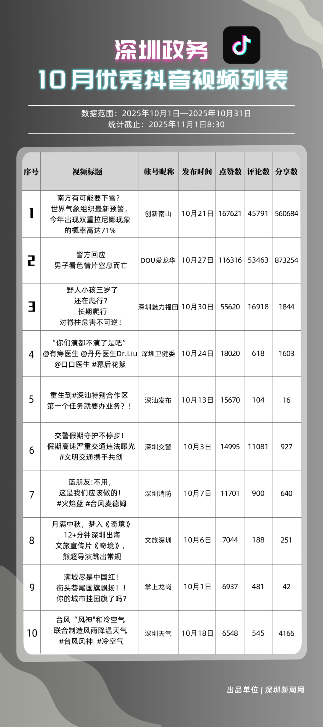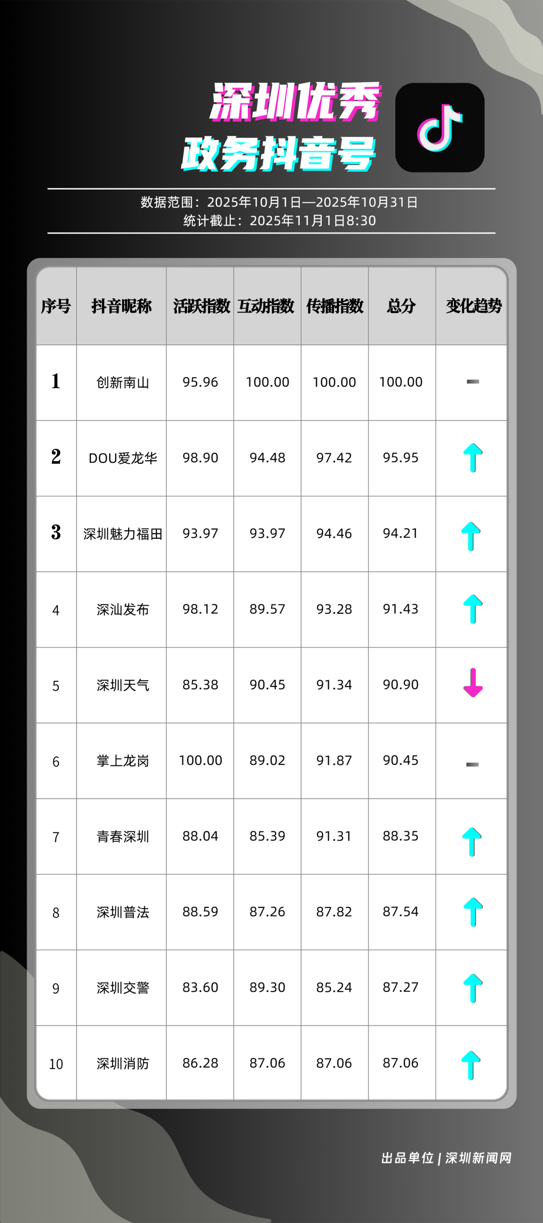 10月,獲得“優(yōu)秀政務(wù)抖音號”稱號的是“創(chuàng)新南山”“DOU愛龍華”“深圳魅力福田”“深汕發(fā)布”“深圳天氣”“掌上龍崗”“青春深圳”“深圳普法”“深圳交警”“深圳消防”?!皠?chuàng)新南山”以總分100分居于榜首,展現(xiàn)出其內(nèi)容創(chuàng)作對用戶的強大吸引力與傳播力;“DOU愛龍華”與“深圳魅力福田”分別位列第二、三位,得分在95分左右,排名較上期有所上升?!吧钌前l(fā)布”“深圳天氣”“掌上龍崗”等賬號得分均在90分以上,以年輕化表達展示實用信息,也收獲較好互動、傳播成績。