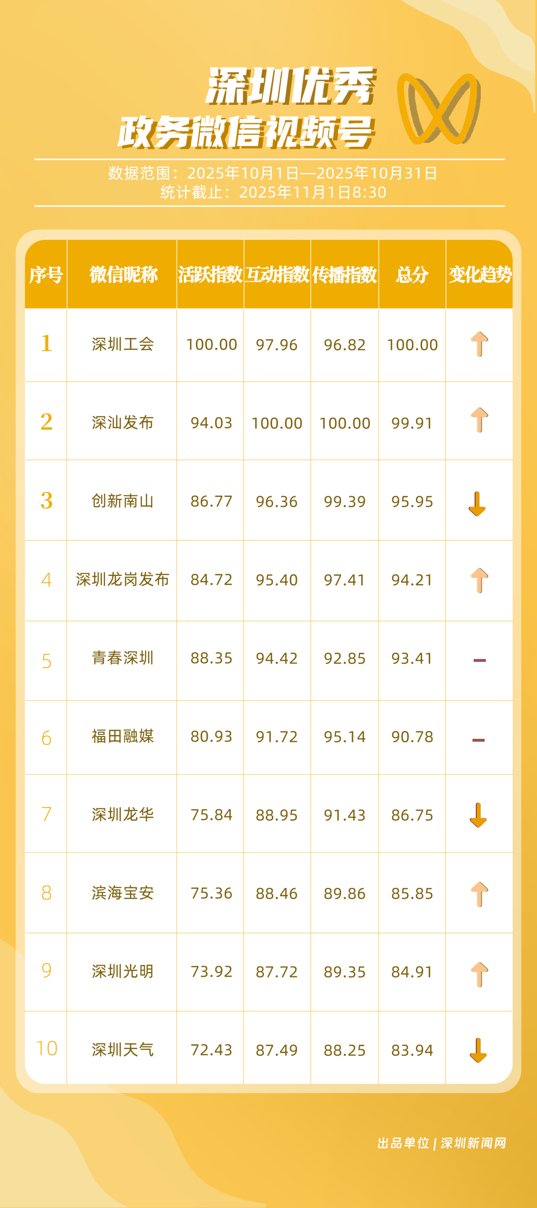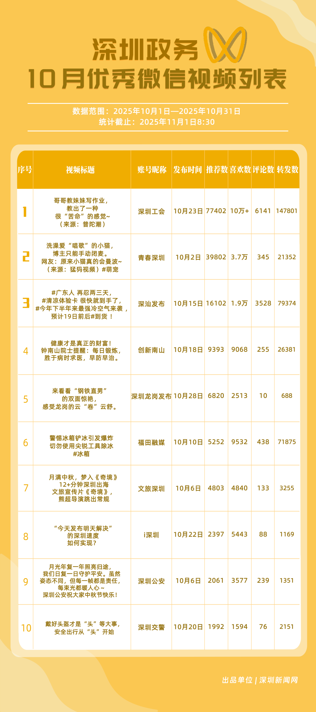 2025年10月期《深圳優(yōu)秀政務(wù)新媒體矩陣》正式發(fā)布,上榜矩陣以深度創(chuàng)新的傳播思路與精細化的服務(wù)持續(xù)領(lǐng)跑,為政務(wù)新媒體行業(yè)貢獻了可復(fù)制的實踐經(jīng)驗,深化政務(wù)信息與公眾喜好的精準對接,為深圳政務(wù)新媒體高質(zhì)量發(fā)展注入新動能與新活力。