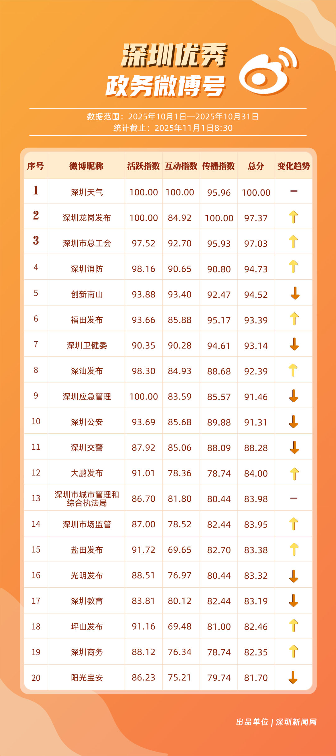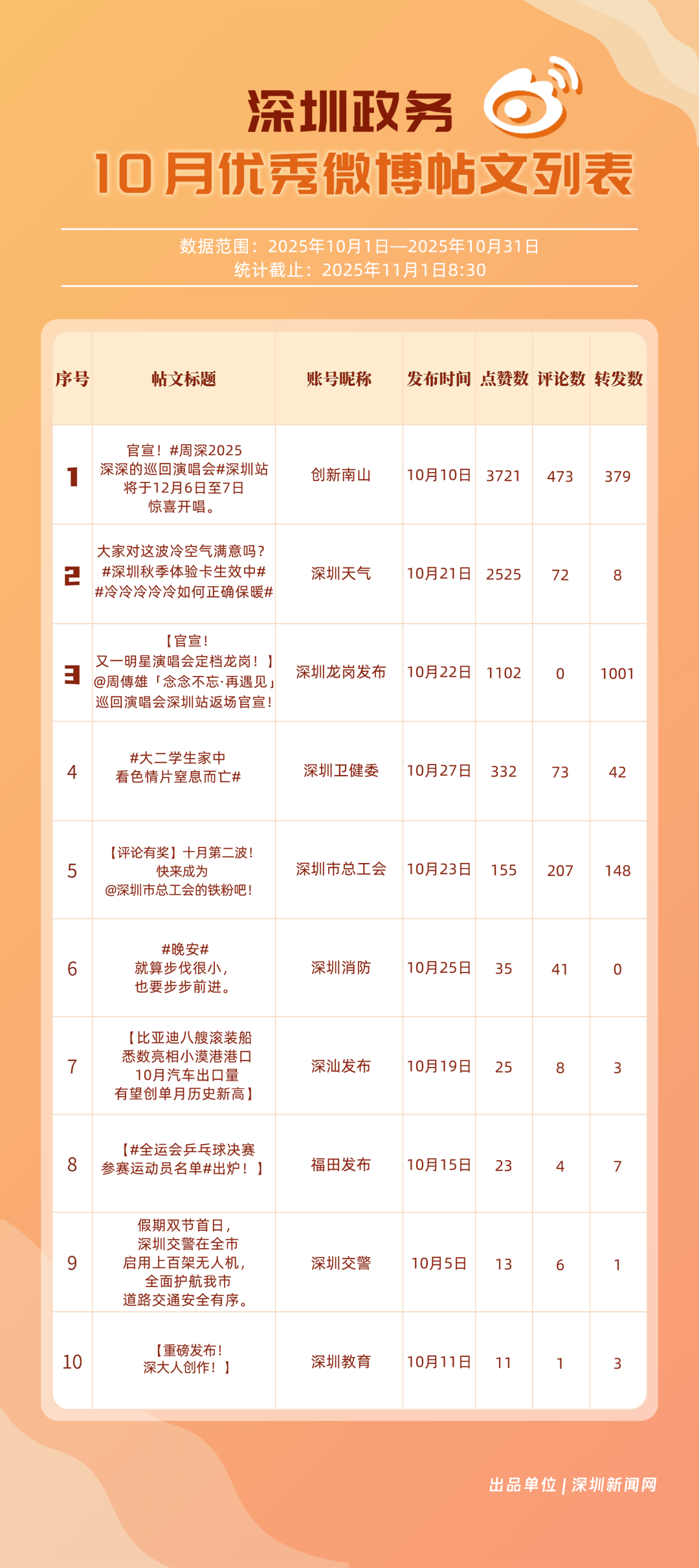 10月,20個賬號入選“優(yōu)秀政務(wù)微博號”榜單,其中包括:“深圳天氣”“深圳龍崗發(fā)布”“深圳市總工會”“深圳消防”“創(chuàng)新南山”“福田發(fā)布”“深圳衛(wèi)健委”“深汕發(fā)布”“深圳應(yīng)急管理”“深圳公安”等。其中,“深圳天氣”高頻、及時地發(fā)布天氣相關(guān)內(nèi)容,其中多篇關(guān)于“冷空氣”“入秋”帖文收獲較好互動和傳播效果,以100分位列榜單首位;“深圳龍崗發(fā)布”總分97.37分,居于榜單第二,其有關(guān)演唱會定檔、卷尺哥等內(nèi)容的帖文獲得較好數(shù)據(jù);“深圳市總工會”關(guān)注職工日常生活,以97.03分居于榜單第三?!吧钲谙馈薄皠?chuàng)新南山”等微博賬號也通過各自的特色內(nèi)容,展現(xiàn)深圳城市治理、民生服務(wù)的溫度。