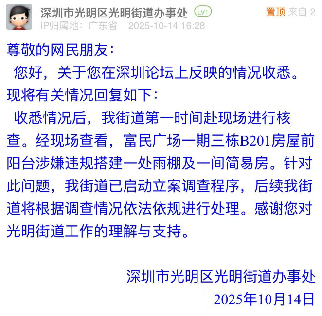 2、有市民投訴光明區(qū)一小區(qū)存在違建