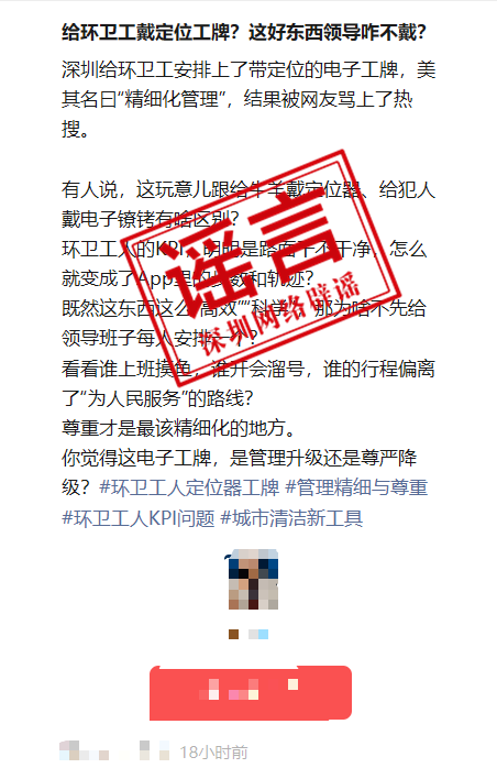記者梳理發(fā)現(xiàn),2024年6月,也曾出現(xiàn)“深圳環(huán)衛(wèi)工人佩戴的定位手環(huán)停留15秒后將自動(dòng)報(bào)警”的謠言,此前深圳市城市管理和綜合執(zhí)法局已辟謠。