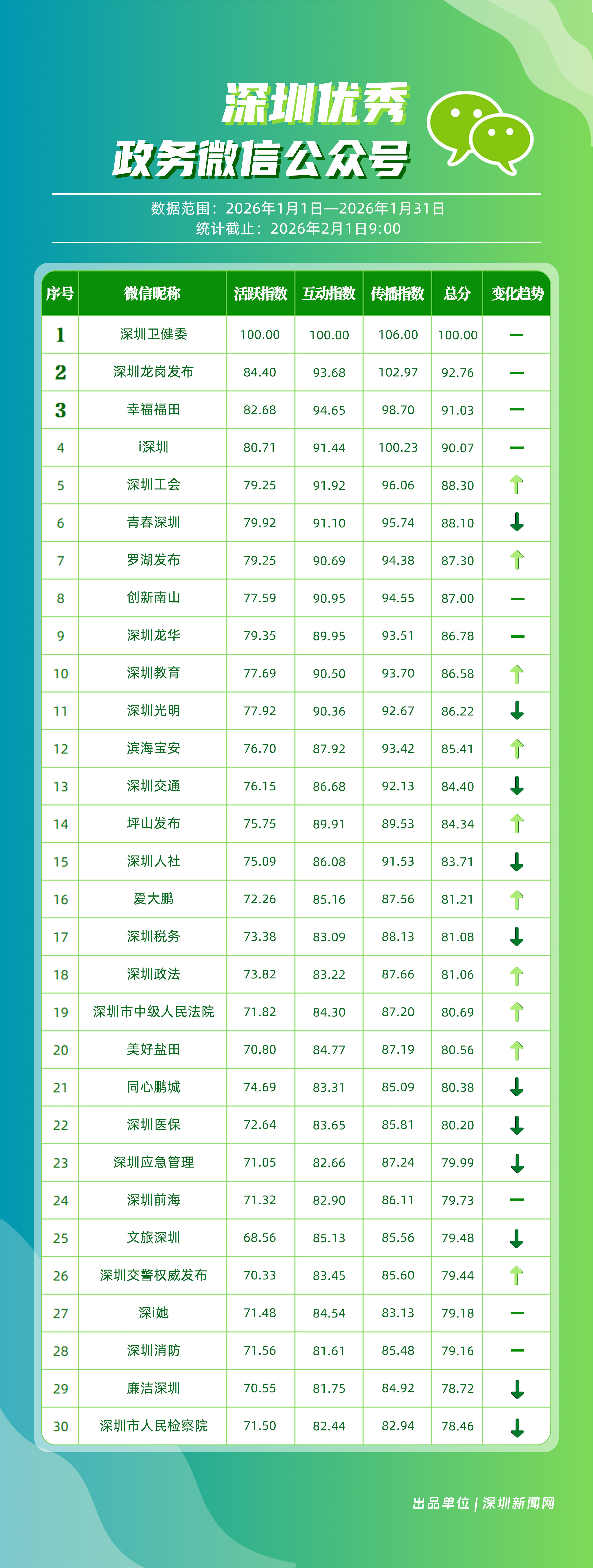 2026年1月,“深圳衛(wèi)健委”“深圳龍崗發(fā)布”“幸福福田”“i深圳”“深圳工會”“青春深圳”“羅湖發(fā)布”“創(chuàng)新南山”“深圳龍華”“深圳教育”等30個政務微信公眾號榮登“深圳優(yōu)秀政務微信公眾號”榜單。1月,頭部賬號“深圳衛(wèi)健委”繼續(xù)保持領(lǐng)先優(yōu)勢,1月份有59篇文章閱讀量突破10萬次,總分100分,穩(wěn)居榜首;“深圳龍崗發(fā)布”在互動與傳播方面表現(xiàn)依然出色,總分102.97分,位列第二;“幸福福田”憑借均衡、穩(wěn)健的運營,在互動與傳播方面表現(xiàn)優(yōu)異,總分91.03分,排名第三。同時,“深圳工會”與“羅湖發(fā)布”等賬號排名相較2025年12月有所提升。上榜微信公眾號持續(xù)深耕內(nèi)容與服務,不斷拓展發(fā)布維度與深化應用場景,在提升政務信息傳播效能、精準對接民生需求方面,發(fā)揮了關(guān)鍵作用。